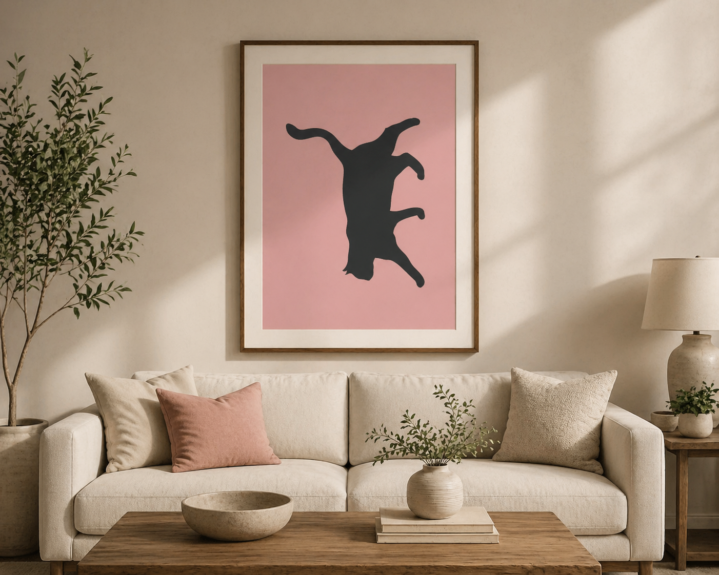 A bold and playful minimalist cat silhouette set against a soft blush background—perfect for modern interiors and animal lovers seeking clean, artistic décor.