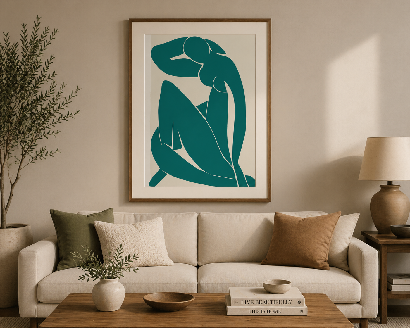 A bold, modern abstract female silhouette in deep teal tones—perfect for adding artistic elegance and minimalist style to your living room.