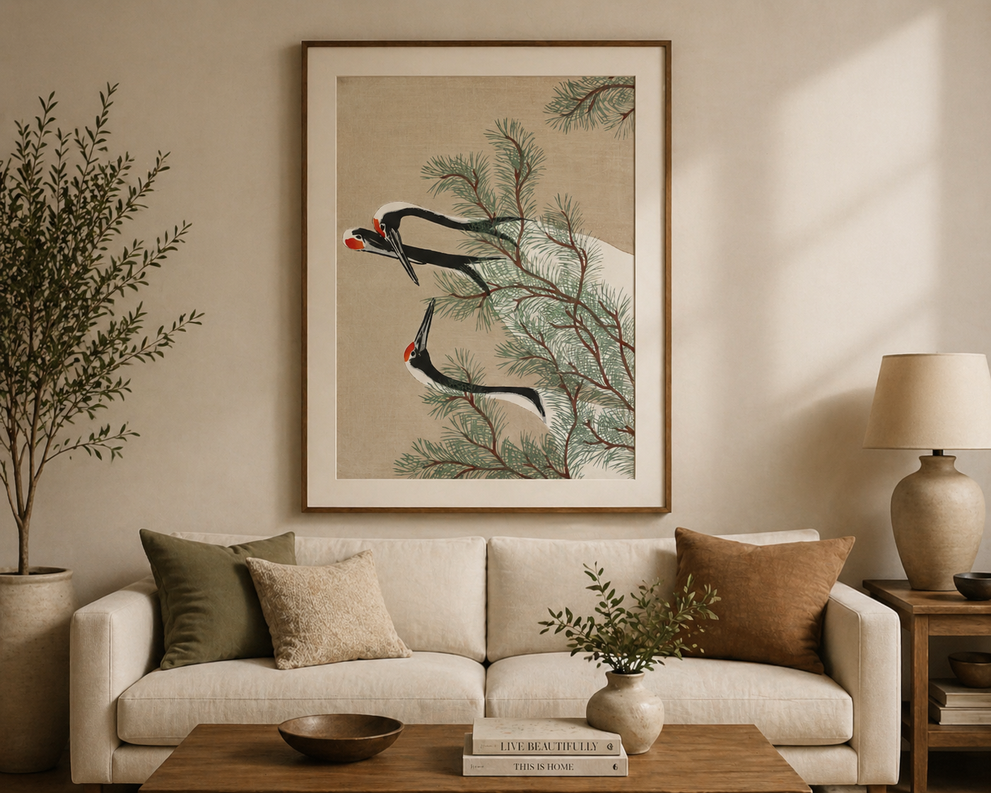 A serene horizontal wall art print featuring elegant cranes and pine branches, inspired by traditional Japanese aesthetics—perfect for calming, minimalist living room décor.
