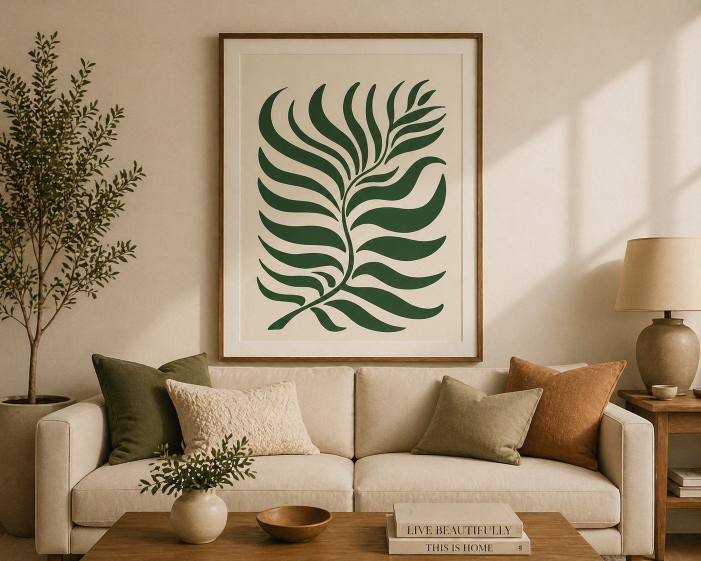 A clean and modern tropical leaf illustration in rich green tones—perfect for adding a fresh, minimalist botanical touch to your living room.