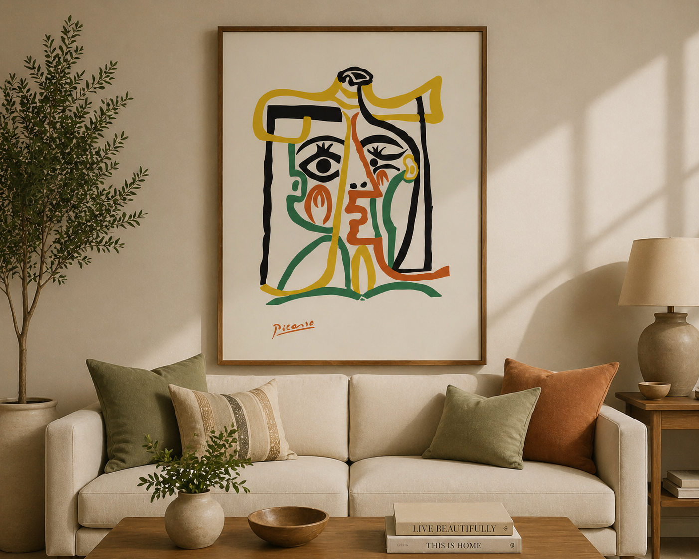 Add a bold artistic statement to your space with this abstract Picasso-inspired face print. Featuring expressive lines and earthy tones, this modern printable artwork brings creativity and sophistication to any living room.